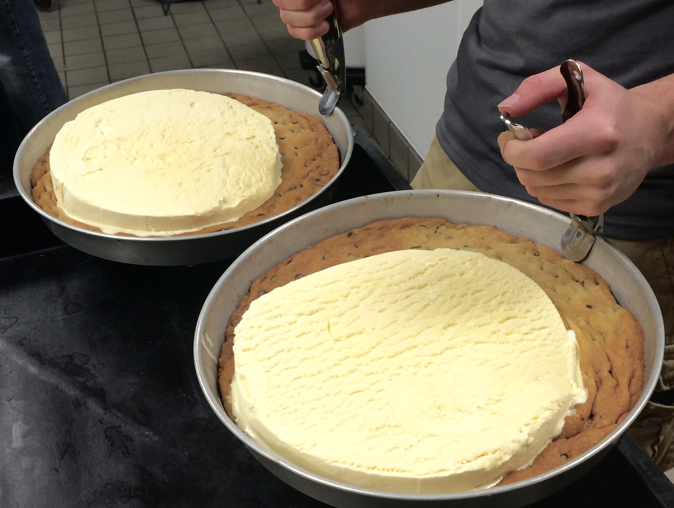 After serving dinner to 400 folks, the Big Cookies – pressed perfectly into their deep-dish pizza pans – go into the oven. Not a moment sooner. While they bake, thick round slabs of ice cream – cut and kept frozen until just the right moment – are rolled out of the freezer. Just as 400 folks finish eating their dinner, the Big Cookies come out of the oven, cooked so that the outside is perfectly browned and the inside is perfectly gooey. Each one is quickly topped with its own wheel of ice cream that cools the cookie innards just enough to maintain the just-on-the-edge-of-gooey stage while the hot cookie warms the ice cream just enough to make it just-on-the-edge-of-melting creamy. And then they’re served. Immediately. Without a moment to lose. While still hot/frozen. While still perfect. While still sublime.