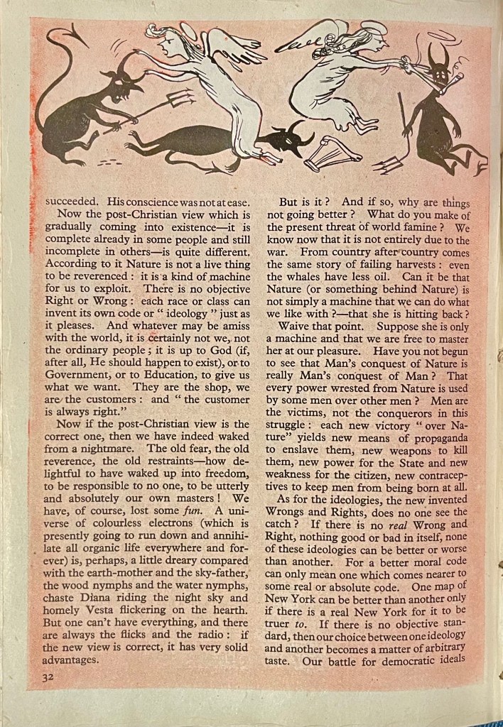 Now if the post-Christian view is the correct one, then we have indeed waked from a nightmare. The old fear, the old reverence, the old restraints—how delightful to have waked up into freedom, to be responsible to no one, to be utterly and absolutely our own masters! We have, of course, lost some fun. A universe of colourless electrons (which is presently going to run down and annihilate all organic life everywhere and forever) is, perhaps, a little dreary compared with the earth-mother and the sky-father, the wood nymphs and the water nymphs, chaste Diana riding the night sky and homely Vesta flickering on the hearth. But one can’t have everything, and there are always the flicks and the radio: if the new view is correct, it has very solid advantages.